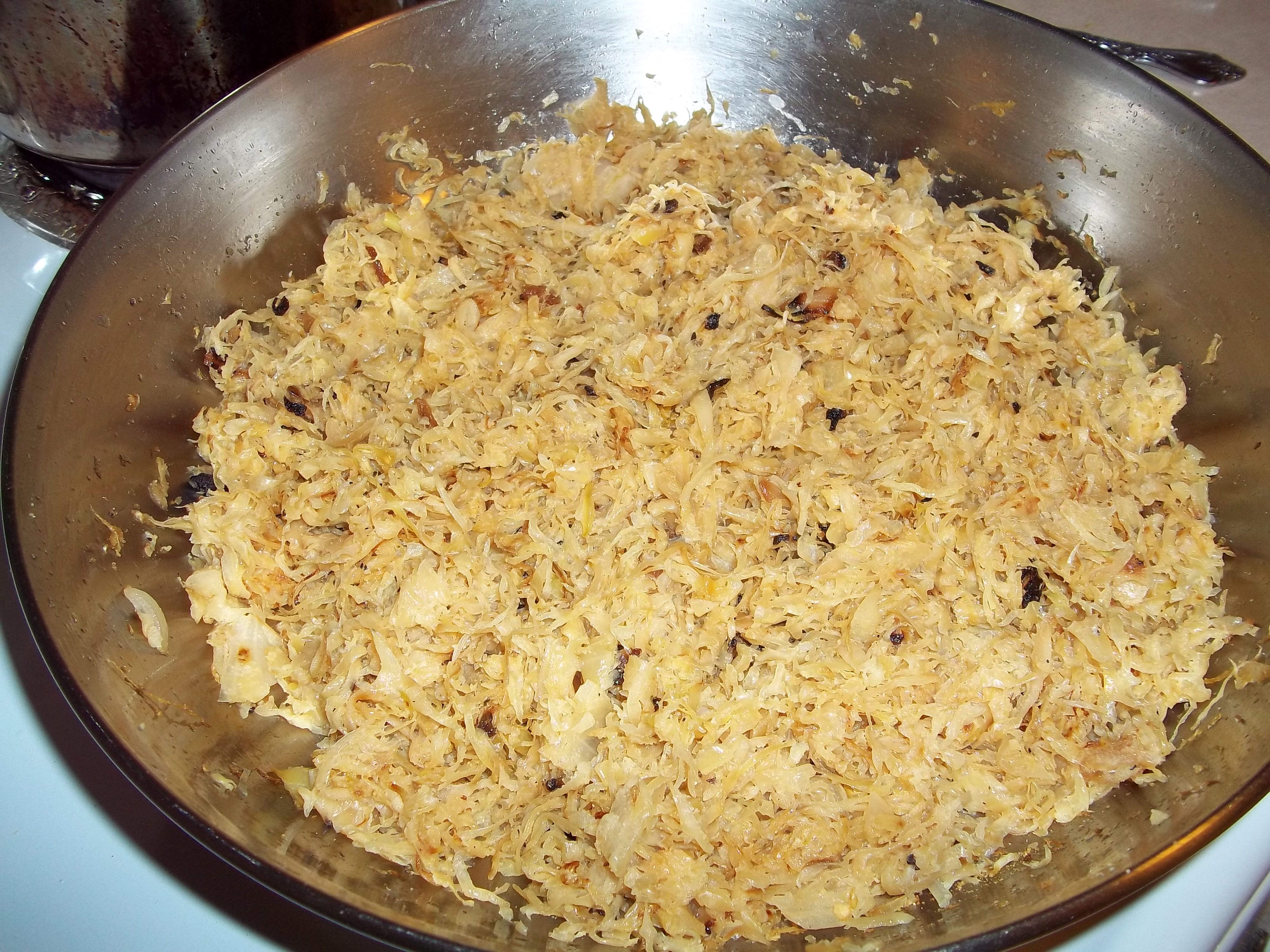 Sauteed sauerkraut, sweet onion and garlic stuffed into pockets of hand-rolled dough. Boiled till tender, then pan-fried till golden and puffed. Delicate! One of my favorite all-time foods!