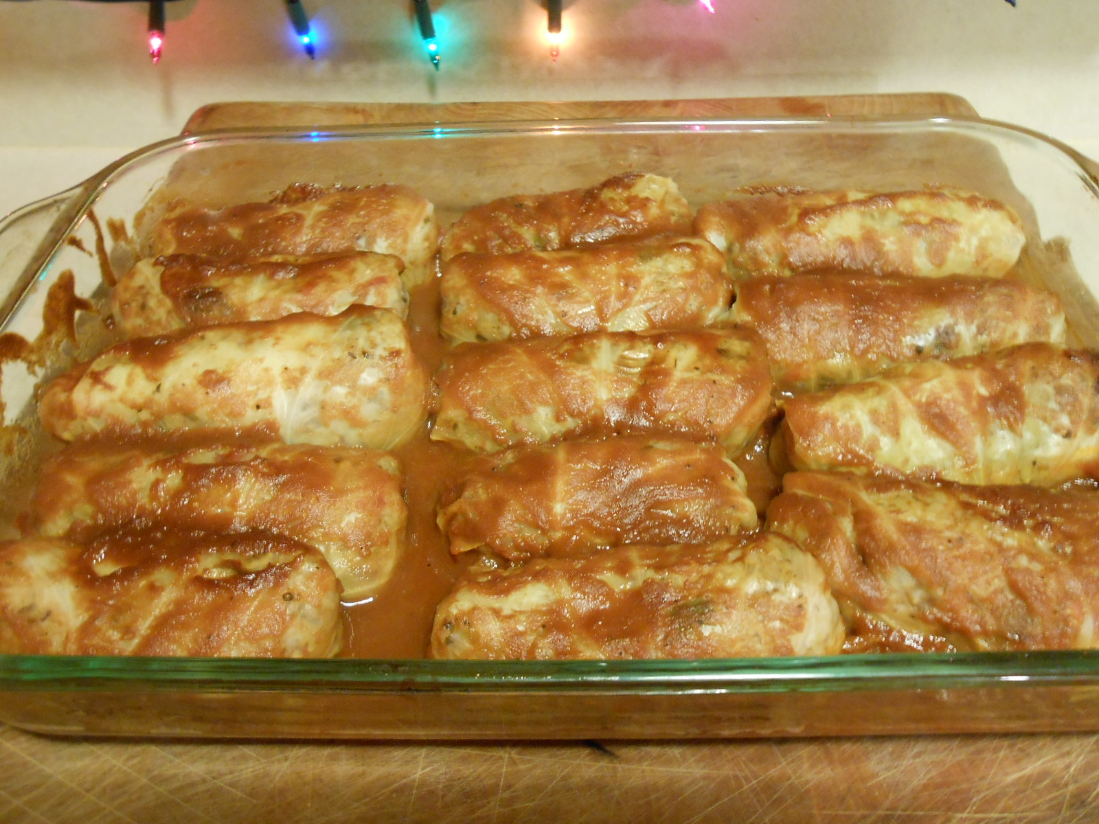 Place in baking dish. Do the same till the baking dish is full. You may or may not have rice left over, depending on how big your cabbage rolls are.