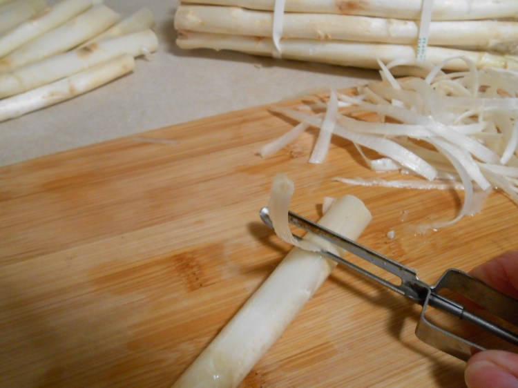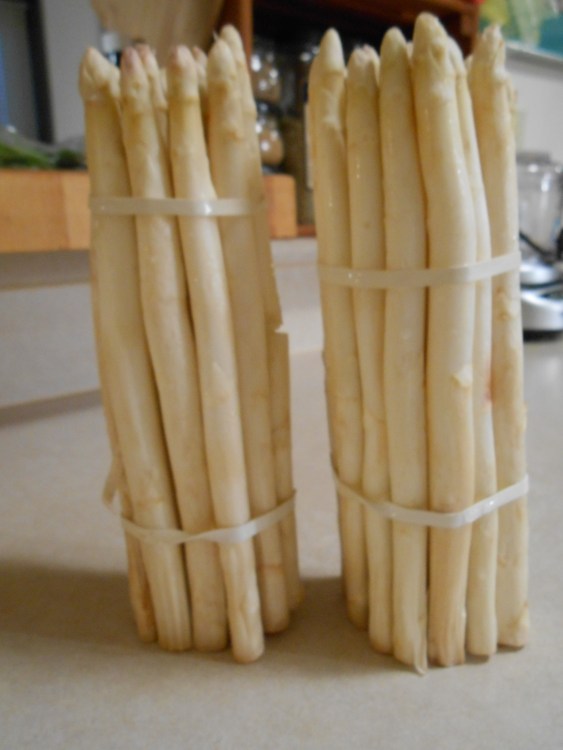 I seem to recall cooking white asparagus years ago in the Pacific Northwest, but didn’t recall how I prepared them, so decided to Google it. Martha Stewart, working with another chef, basically said that the best way was to boil them, tied in a bundle, standing up, and that you really couldn’t over-cook them, but about 30 minutes is what it takes. In checking a few more places on Google, everybody essentially said the same.