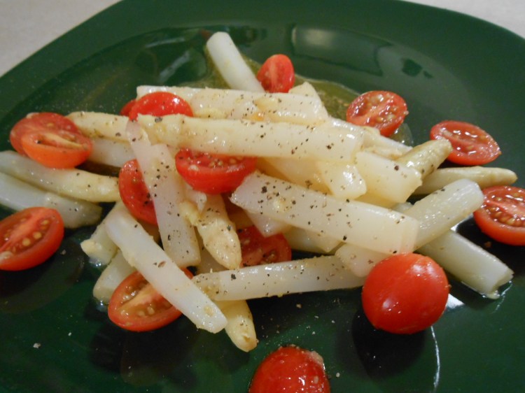 Next, I placed drained, cooked asparagus in bowl, poured melted margarine and tomatoes over asparagus, tossed gently and plated.