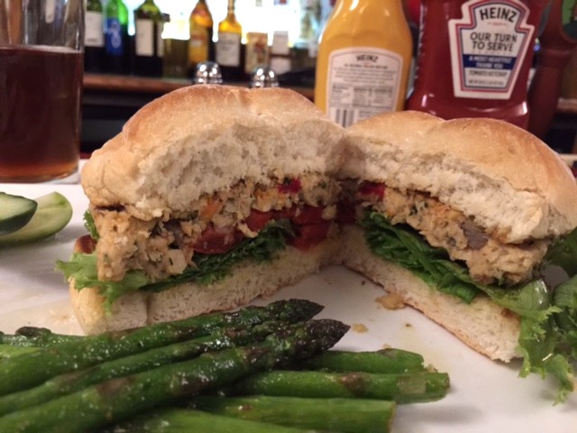 When the veggie burger arrived I was pleasantly surprised. I have no idea the company that makes it, but it was delicious, along with the bun, condiments and roasted or dried marinated tomatoes. I picked a side dish of grilled asparagus instead of fries. So all went well.
