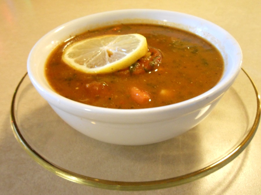 Made with vegetarian beans, roasted peppers, corn and spinach. Seasoned with garlic, basil, coriander and mint. Served with a lemon slice float!