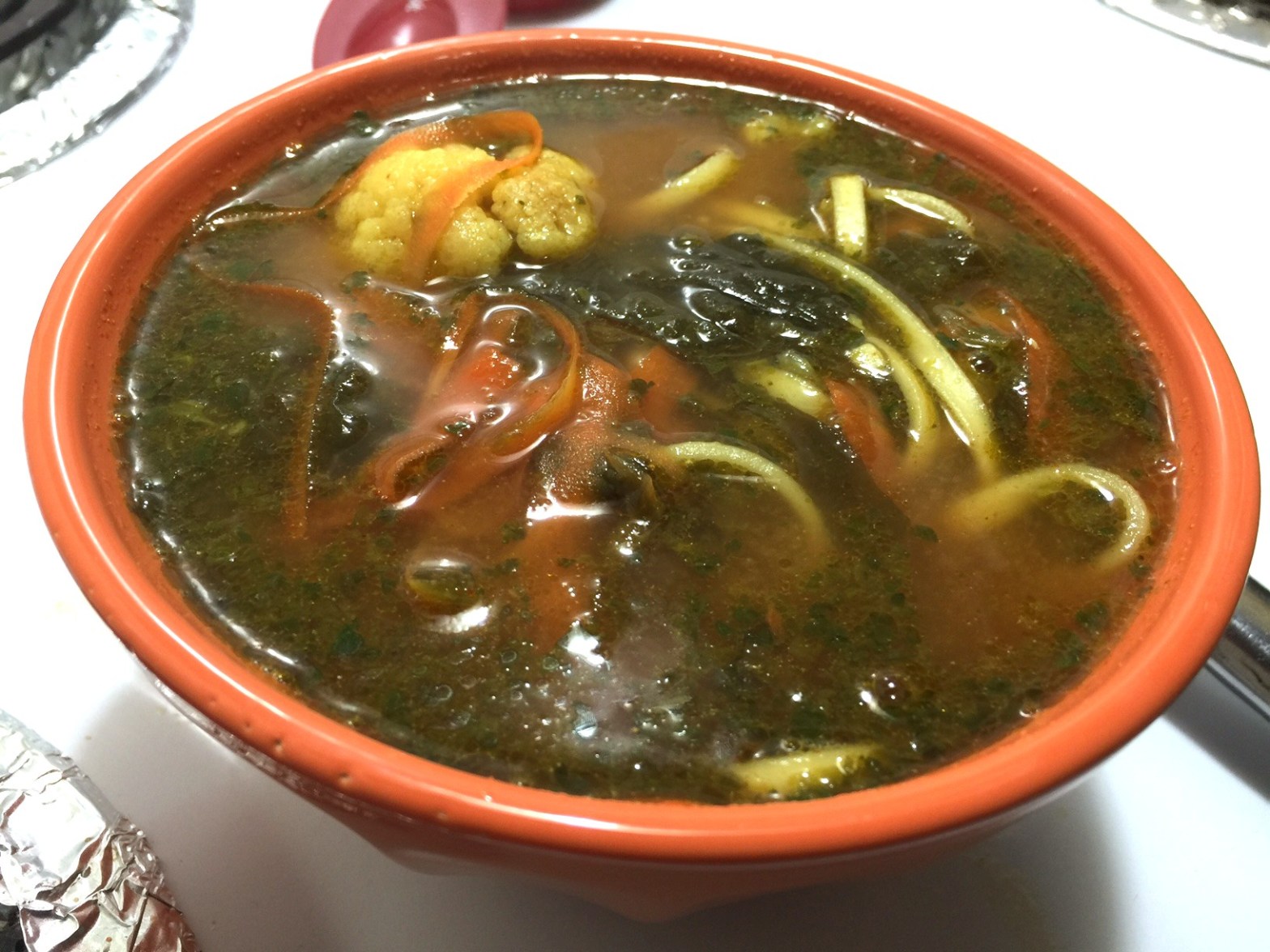 A hot and sour cauliflower soup with spinach, leftover baked potato and carrot ribbons floating with udon Japanese noodles and cilantro oil in a white miso, garlic, coriander and smoked paprika broth! The best hot and sour soup I’ve ever tasted!