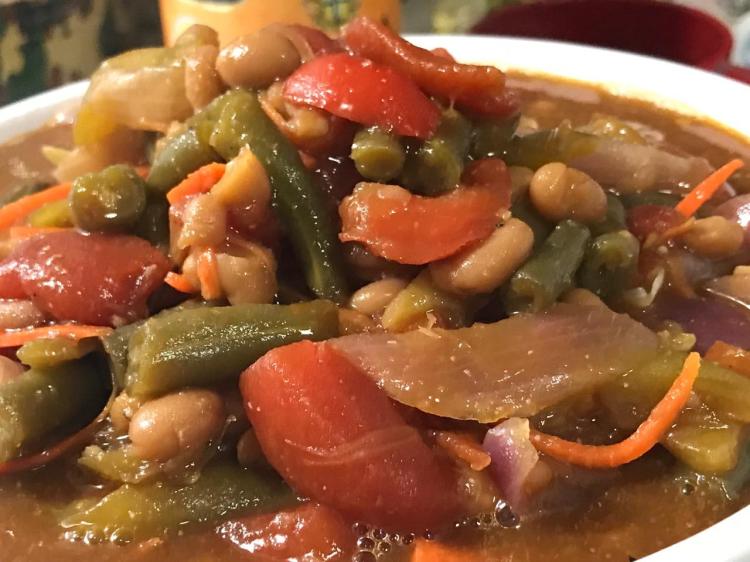 Vegetarian baked beans mixed with caramelized red onion, multi-colored pepper strips, stewed tomatoes, green beans and carrot matchsticks. A light-flavored and colored sesame seed oil teamed with Balsamic vinegar and garlic create the rich foundation that brings together all ingredients, elevating them in one simple yet elegant main dish.