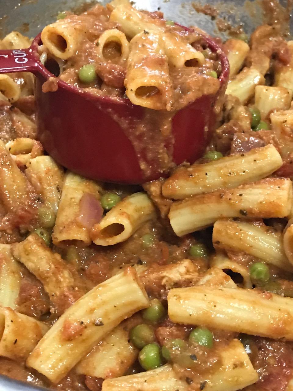 Batali Meets Gardein Posted bysharonleedaviestight12/21/201710/31/2018Posted inCOOKING WITH LARGE CANS/bagsTags:bronze extruded pasta, Gardein Chick'n Strips, Guy Fieri, MARINARA SAUCE, Mario Batali, PASTA, PEAS