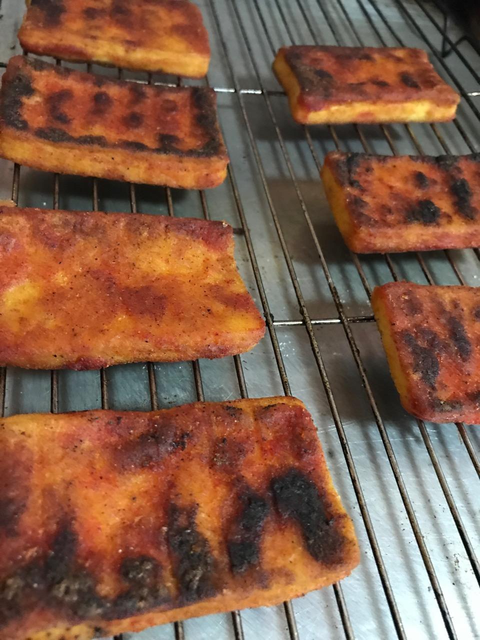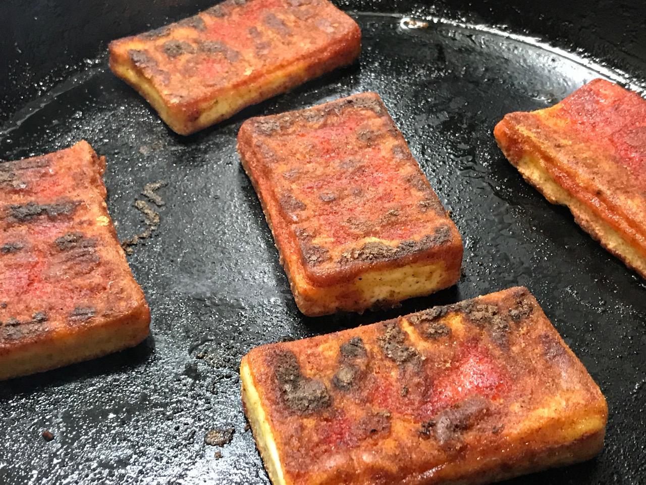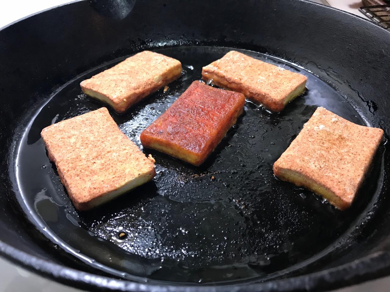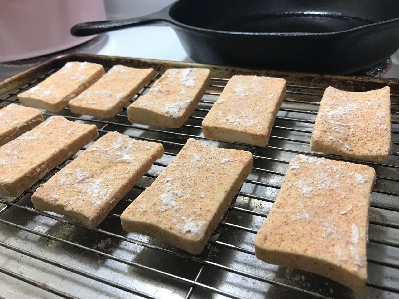 Repeat with remaining nine tofu planks. Leave tofu planks on rack on counter for at least 30 minutes to give the tofu a chance to moisten the coating. Longer is fine if you get distracted with some other task.