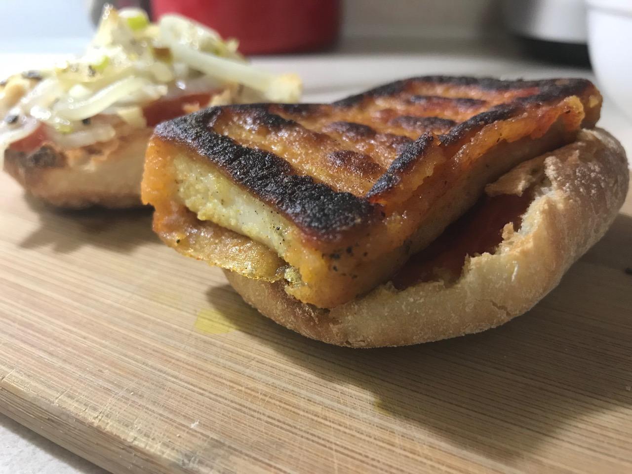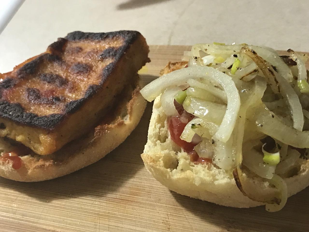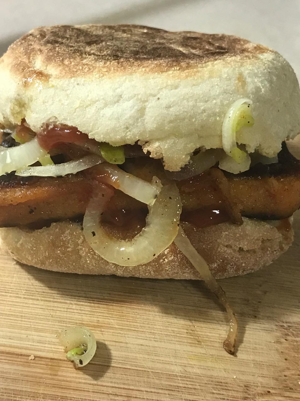 FRIED TOFU AND ONION ENGLISH MUFFIN