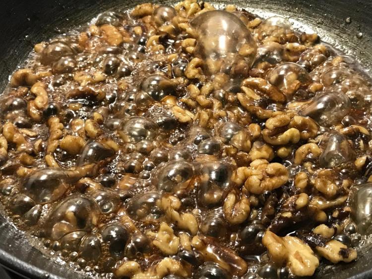 When liquid evaporates and walnuts are still moving about loosely in a minimal amount of syrup, remove pan immediately from heat.