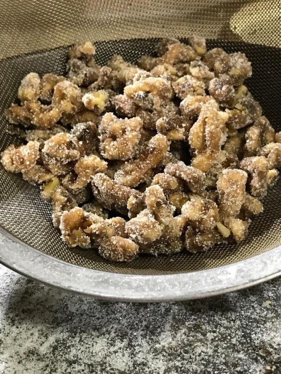 When done, shake strainer to remove excess sugar and lay walnuts out on a plate in one layer to further cool to room temperature.