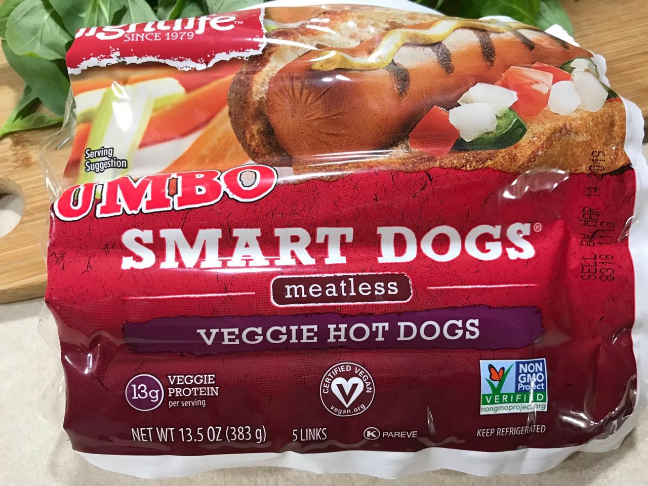 > Veggie hot dogs, sliced in half from end to end, then in half crosswise, pan-fried in a little oil till hot – I used LIGHTLIFE JUMBO SMART DOGS