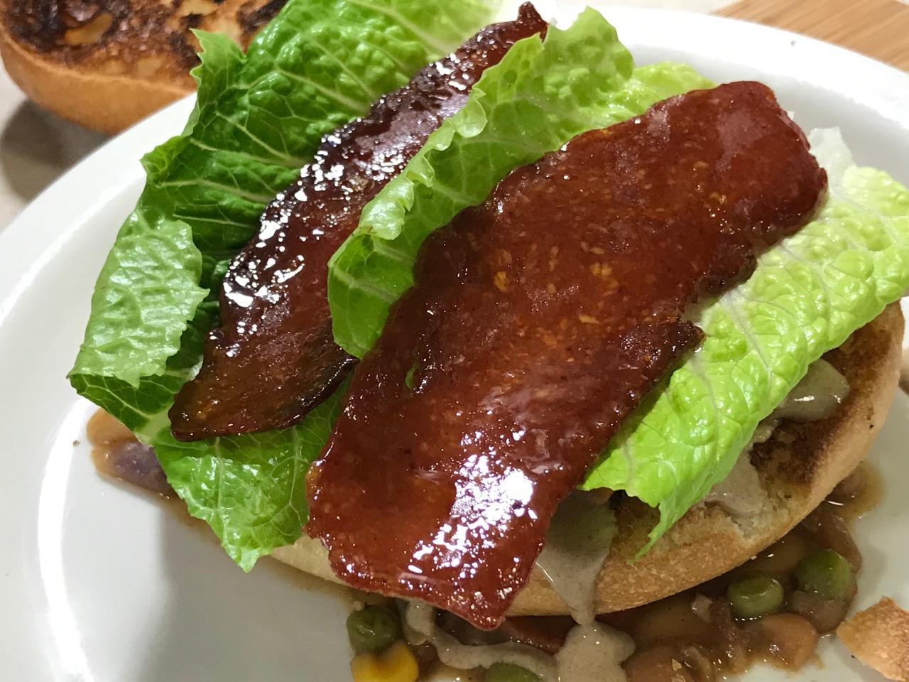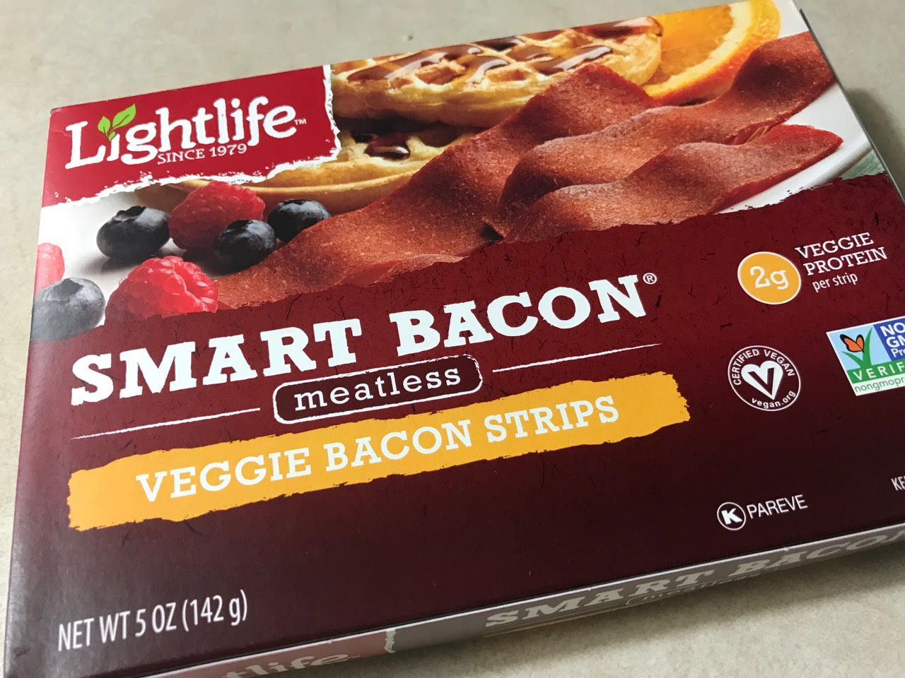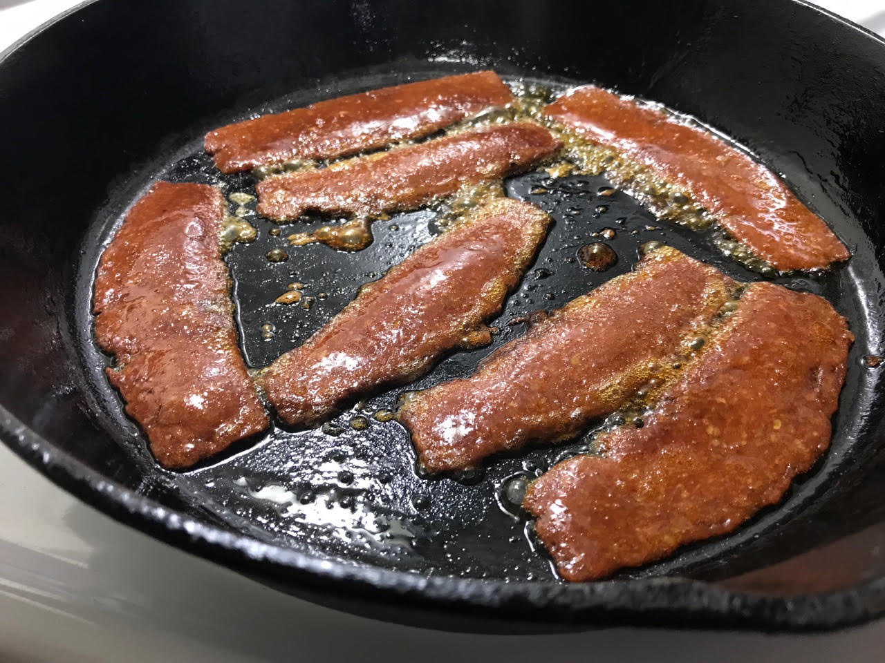 > LIGHTLIFE meatless SMART BACON, thawed and pan-fried according to package instructions in a little oil, followed by a little maple syrup, being careful not to cook too long, otherwise it will stiffen beyond use