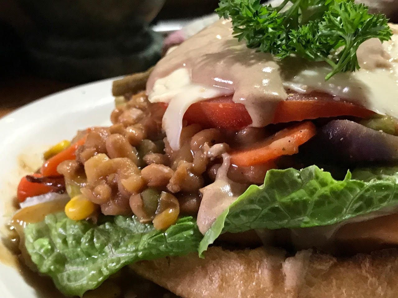 Baked beans aren’t just for service as main or side dish. They make good sandwiches too. Make your own baked beans or use canned. I made a deluxe knife and fork sandwich using a recent VEGGIE POT BEANS recipe I developed. Over the top. It sure was good though.