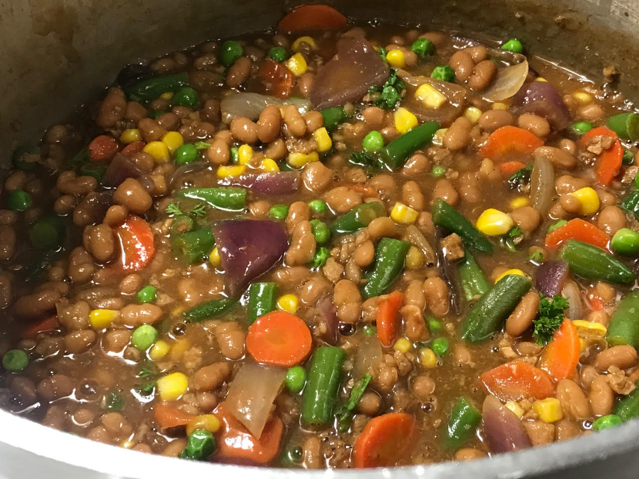 A hearty pot of baked beans and veggies. Smoky, sweet, salty, spicy, acidic. Textured with reconstituted vegetable protein to increase nutritional content and uptick the chew factor. You don’t need ground pork or bacon with these beans. The textured vegetable protein sauteed with seasonings create the chew and flavor you expect!