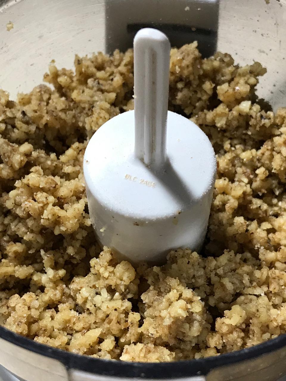 Add liquid smoke and salt, then process till evenly mealy – not mushy. Set aside.
