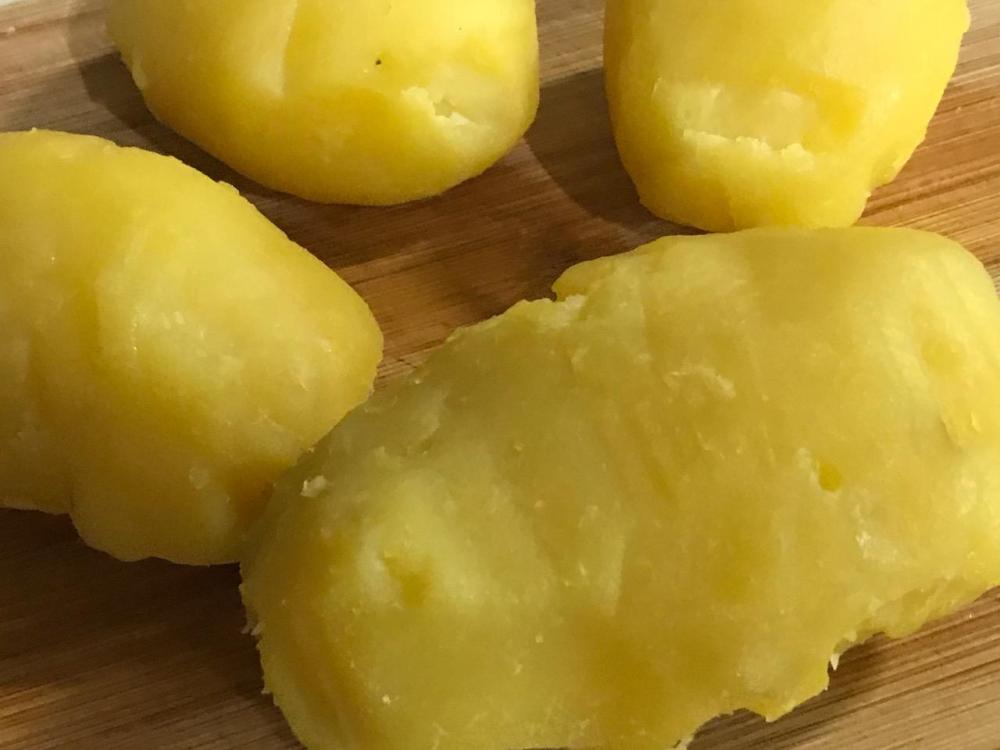 2 lbs. yellow potatoes – wash, place in pot of salted water with 4 inches head space, bring to boil, cover, reduce heat to medium and cook till fork-tender, drain – when cool enough to handle, peel, then cut into 3/4 inch cubes or bite size