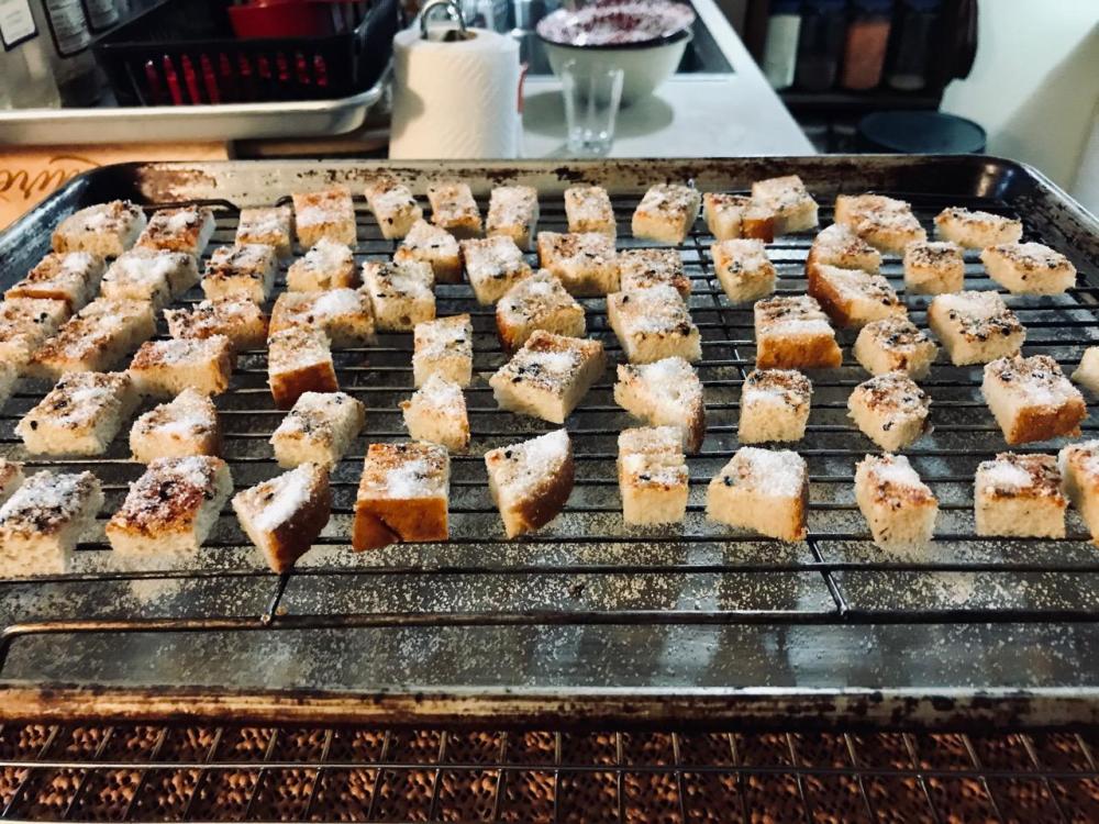 It’s a party crouton! Pick a salad of greens or a coleslaw and make everybody’s day by topping it with these candied bread croutons. They’ll rave and you’ll be the star of any gathering! They taste like they were grilled over an open-flame – a little marshmallow taste as well!