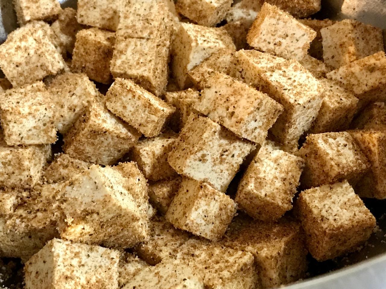 Place tofu cubes in bowl and flip the bowl with some wrist action till cubes are coated.