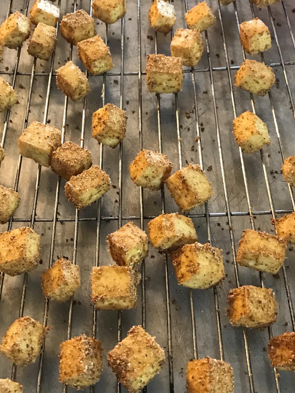 Place tofu cubes away from each other on the racks. Bake in preheated 300 degree oven 20 minutes. The higher rack will cook sooner, so check to see how they’re doing. I went 10 minutes longer, since I was looking for a drier cube.