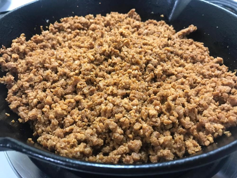 Add V. beef crumbles to pan. Stir to coat all crumbs. They’ll still be dry, but do the best you can.