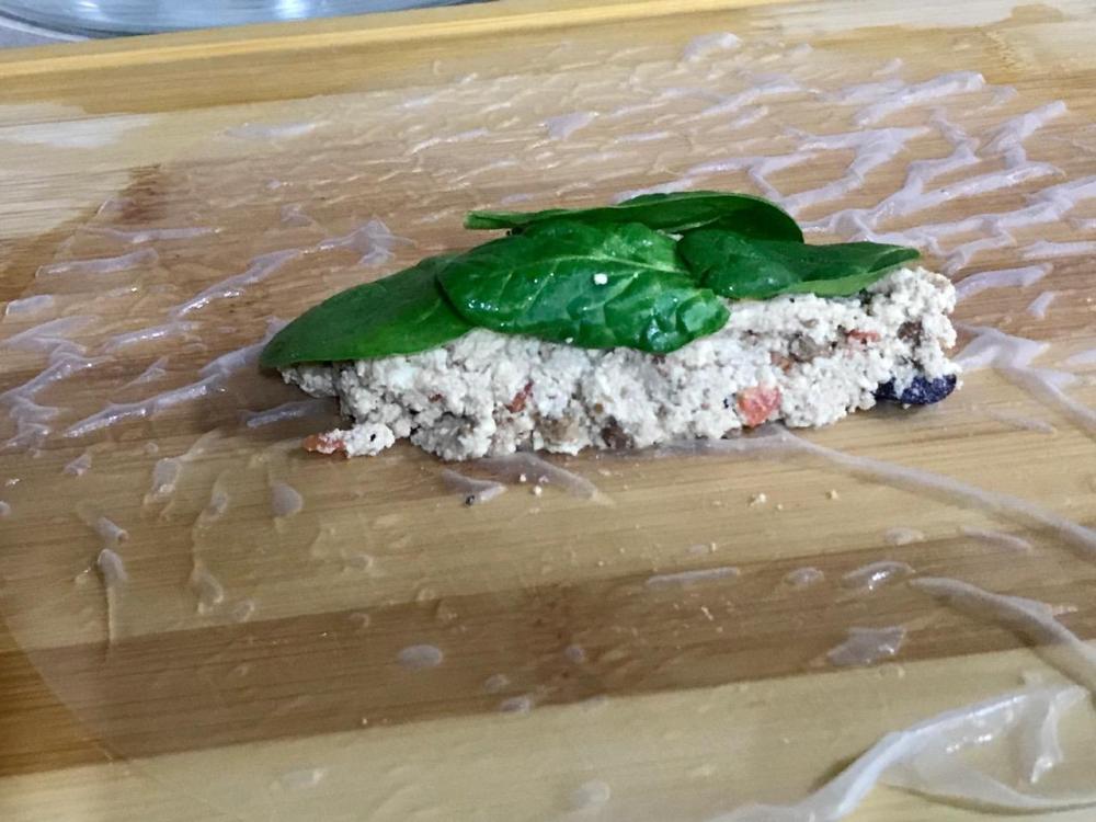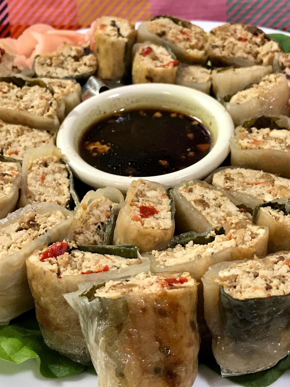 Sloppy Something mix rolled in spring roll skins with fresh spinach, baked, then cut into appetizer size pieces. Served on a bed of fresh spinach with a dipping sauce and pickled ginger slices! Textures like a delicate sushi with skin reminiscent of baked trout skin! All animal-free of course!