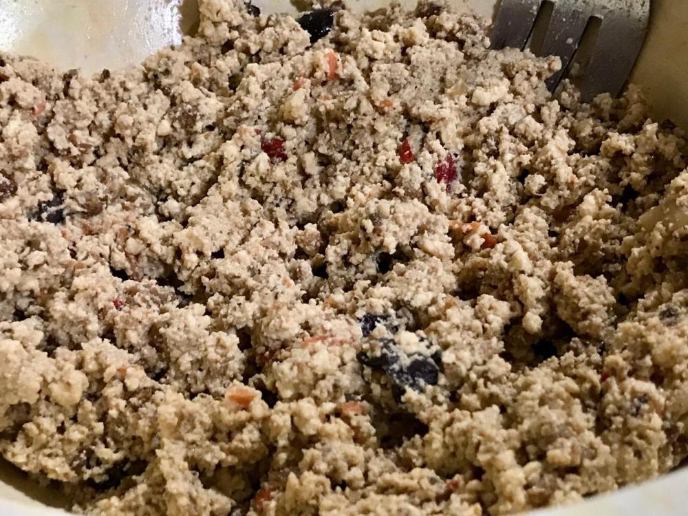 Mix all ingredients in large bowl till evenly dispersed and thoroughly incorporated. I use a potato masher, then a sturdy spoon. Set aside.