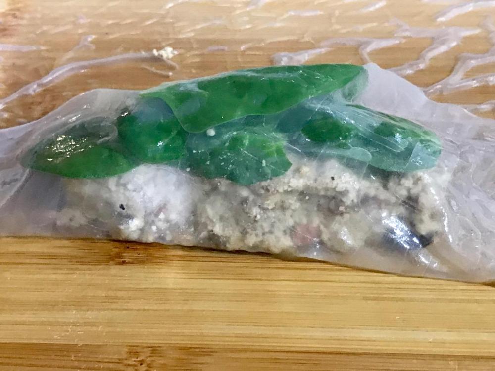 Now place only enough spinach on top of the log to cover it – don’t pile the spinach on. Leaf size will dictate how many. If leaves are large, then split them.