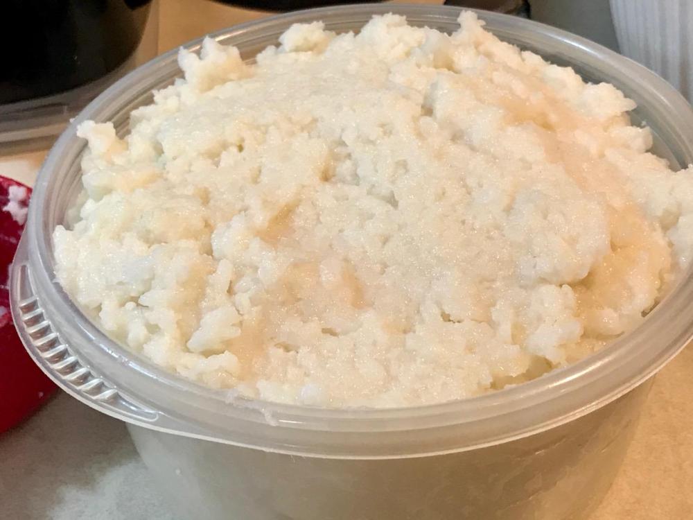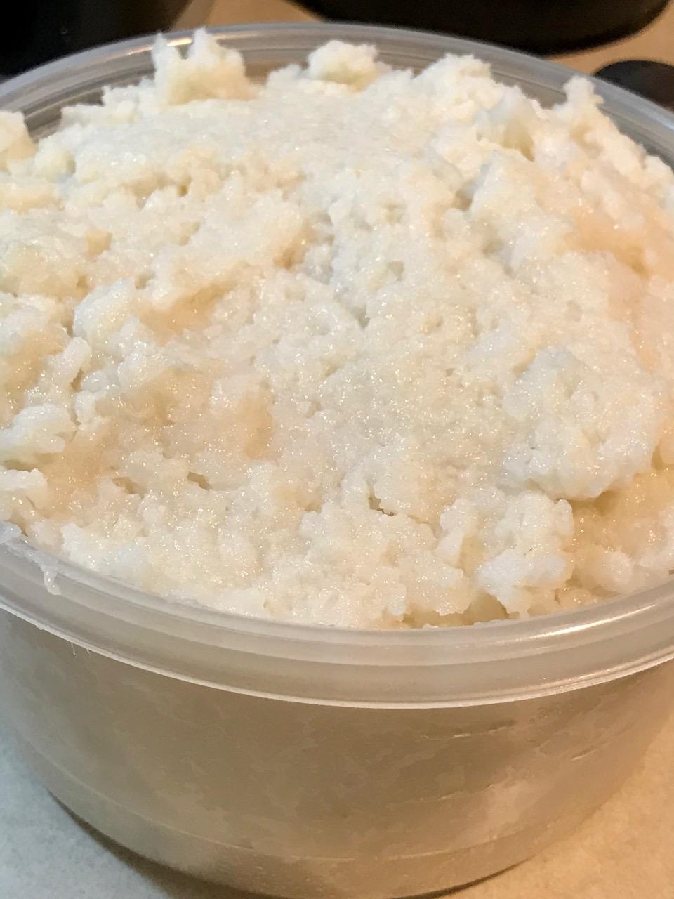 When it’s first made, RICE PASTE is soft and very pliable. Over days in the refrigerator it hardens up. So if using in first 2-3 days, it’s okay like it is. If much older than that, then do your blended water-to-paste RATIOS to use for sauces and dressings or thickener.