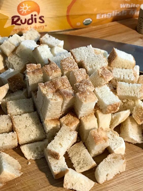 2 English muffins – stack evenly, then cut down from top using 7 even cuts, keeping the muffin in place, then turn muffins and cut crosswise the same number of cuts down from the top to make cubes
