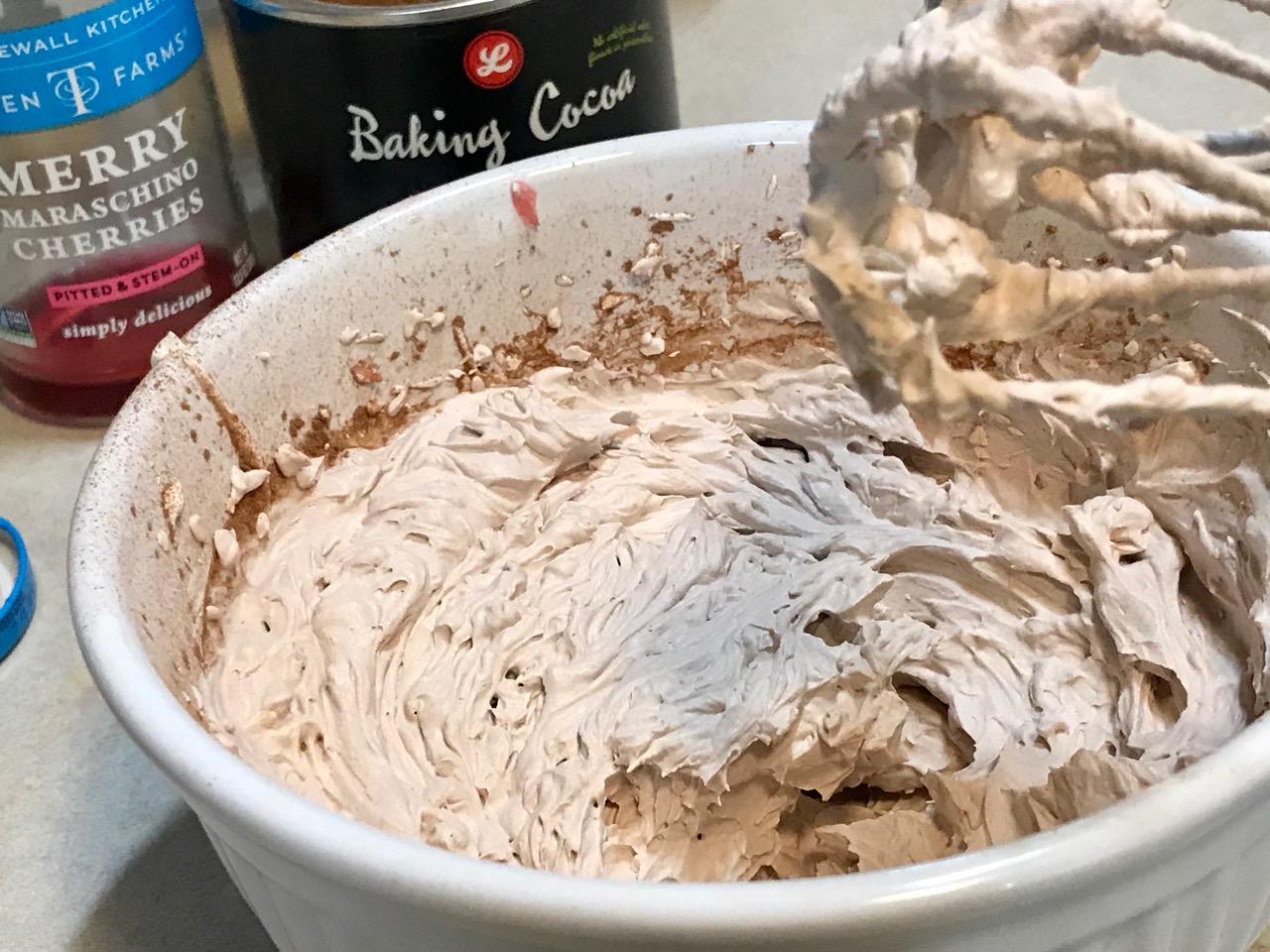 8- Add cocoa powder, maraschino cherry juice and chopped cherries. Continue to whip till you achieve stiff peaks.