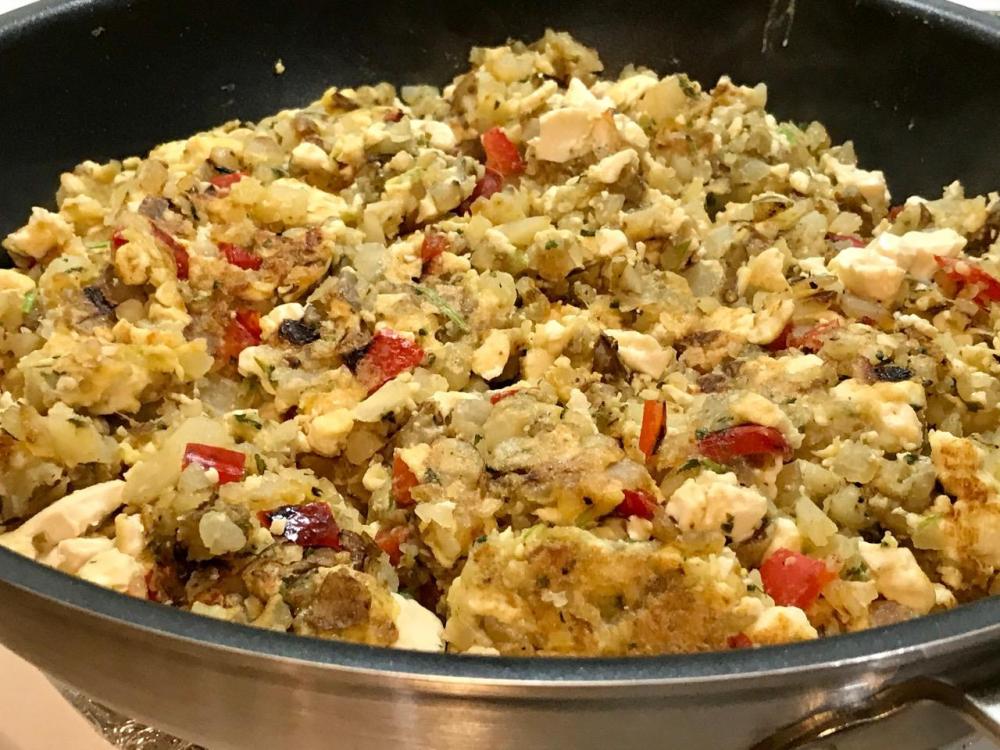 5- Pour JUST EGG liquid evenly over mix, stir, lift and turn till even throughout. Cook till liquid is no longer apparent and total mixture is firm not mushy.