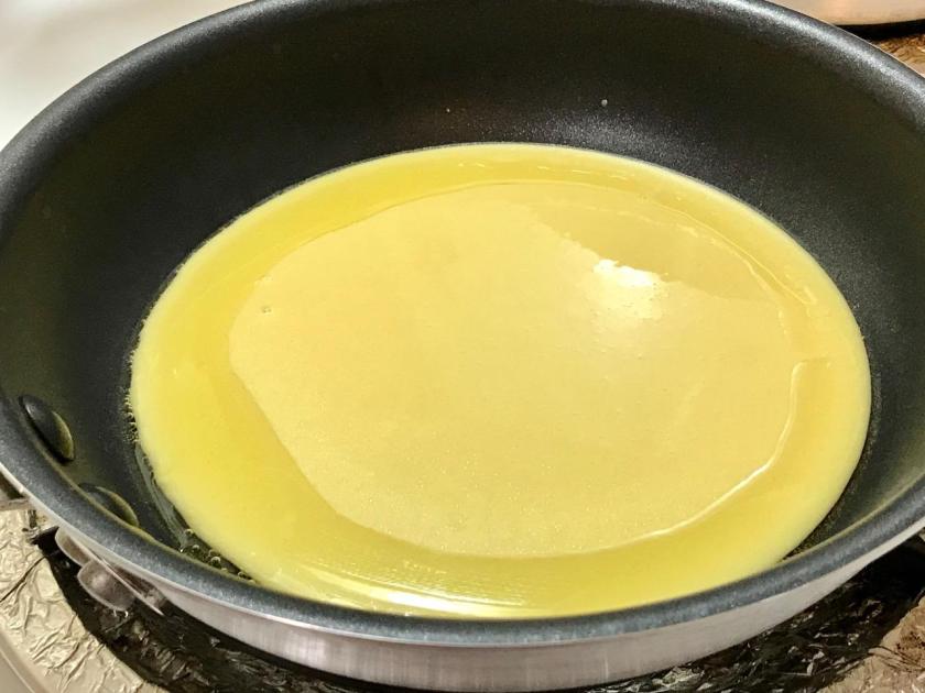 2- SHAKE WELL the JUST EGG in the container. Pour 1/2 cup evenly into skillet and wait till it starts to bubble up, then push gently with spatula and roll to flip till all surfaces are cooked.