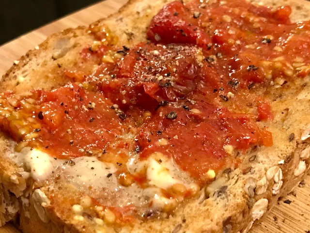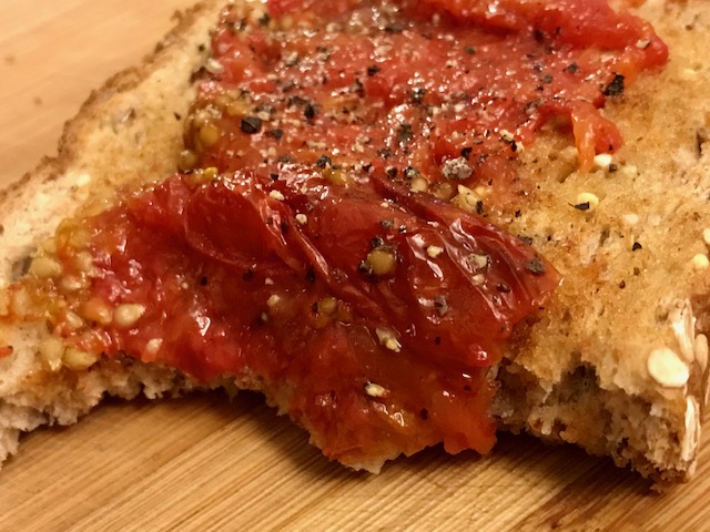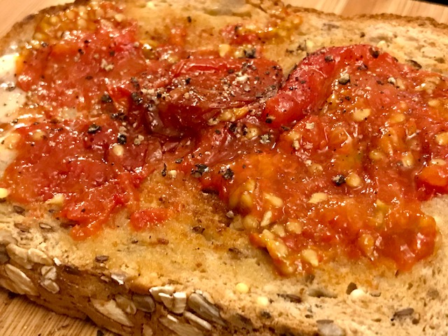 Toast your favorite bread; spread with margarine or extra virgin olive oil. Place tomato on toast and smear it with a spoon. That’s your jam.