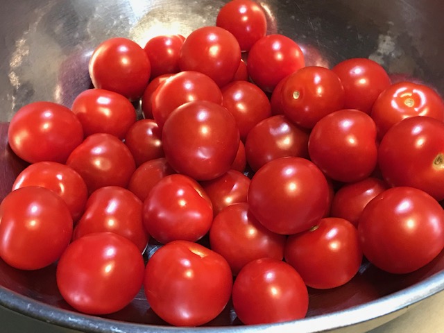 4 pkgs. cocktail tomatoes – larger than cherry tomatoes – wash, cut core tips off each