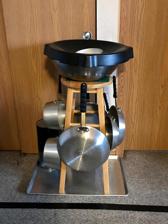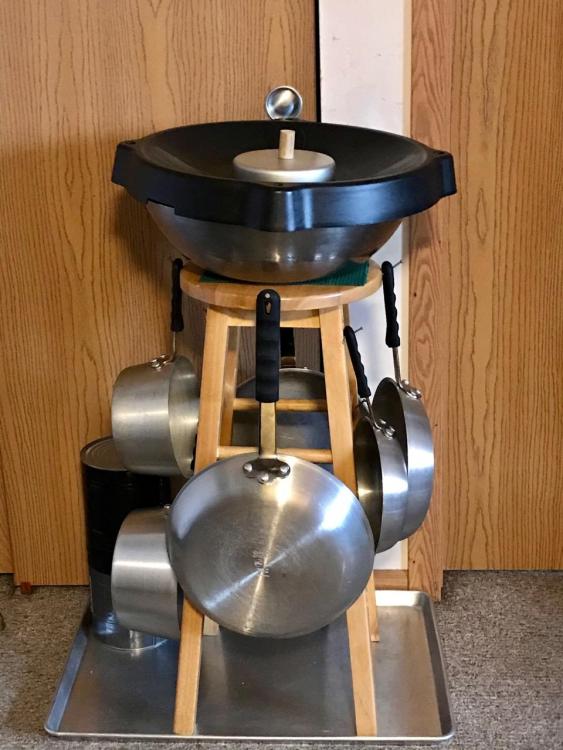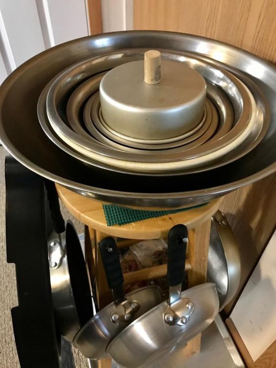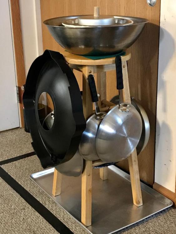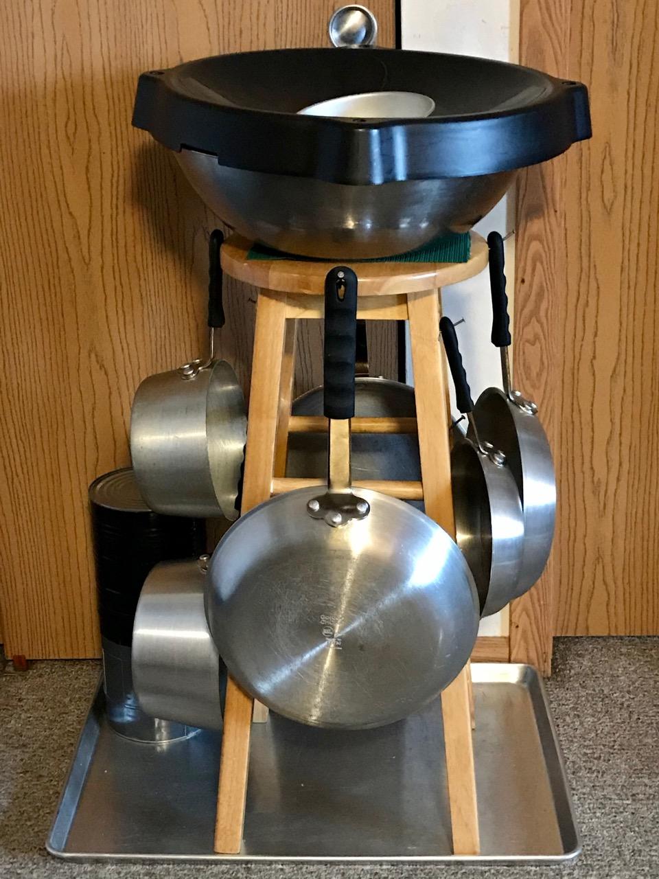 The very top is a small cake pan that I inserted a screw into and drove it into a cork to be used as a lid-to-skillet cover for melting cheese on animal-free burgers in a skillet, that fits down into the skillet.