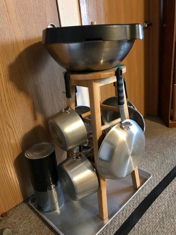 I solved my lack of space for pots and skillets by buying a wooden stool and large nails with large heads. Then I pounded them in at an angle so the handles wouldn’t slip off and there it is. Standing right in front of the pantry where I can still access the pantry without moving the BUTLER.