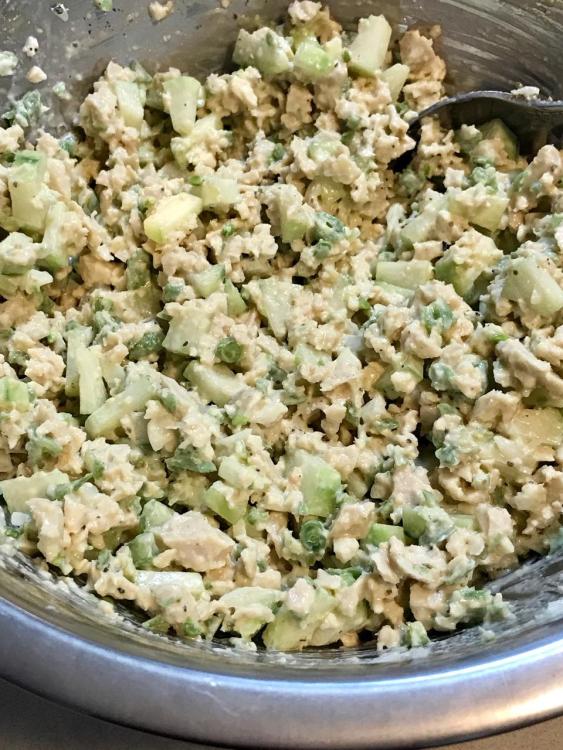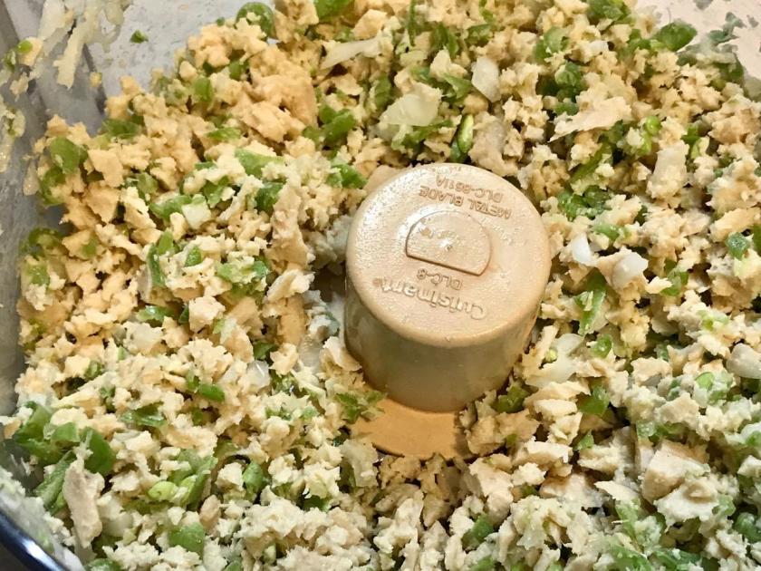 1- In large food processor place vegan chicken, celery and onion. Pulse and Process till chunky. Transfer to large mixing bowl.