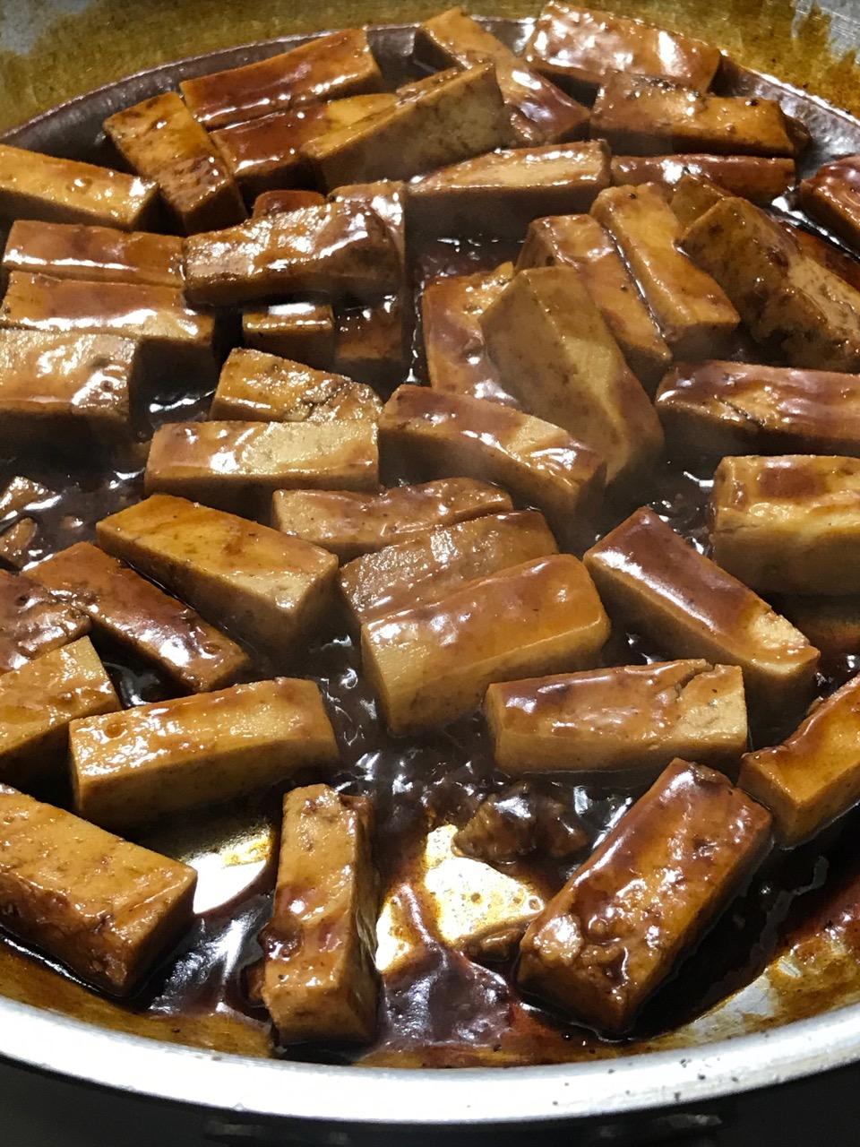 Pressed tofu is harder than regular tofu, but it still breaks easily in the pan, so be gentle with it.