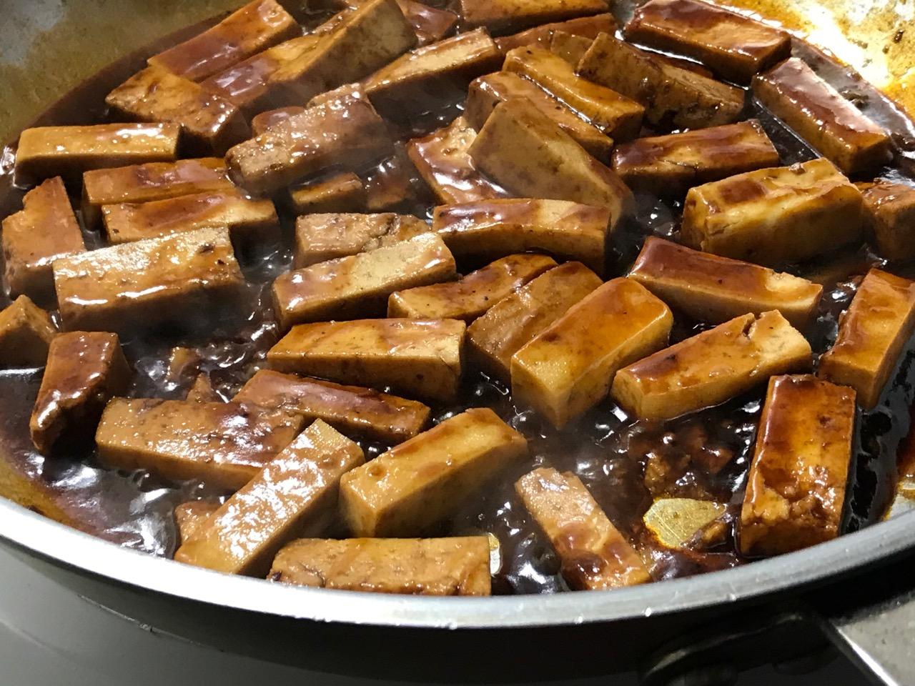 Pressed tofu is harder than regular tofu, but it still breaks easily in the pan, so be gentle with it.