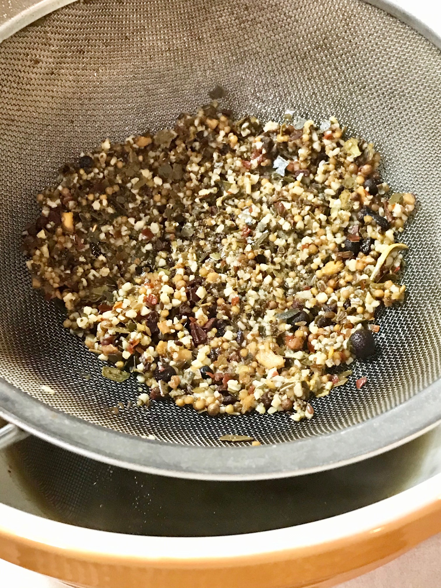 1- Combine vinegar, brown sugar, pickling spice, green tea, fennel and salt in large saucepan. Stir, bring to slow boil, cook about 5 minutes. Strain through wire mesh strainer into bowl, then return to clean pot.