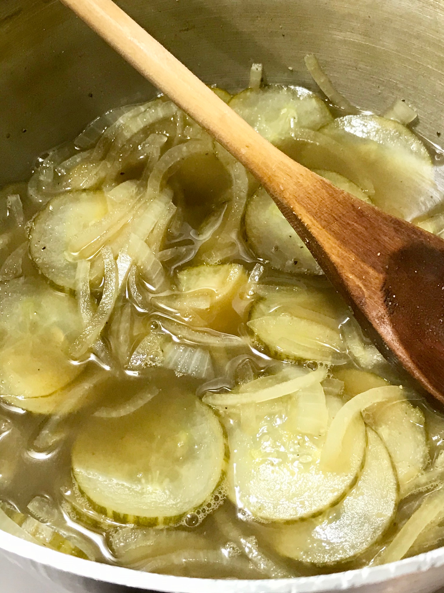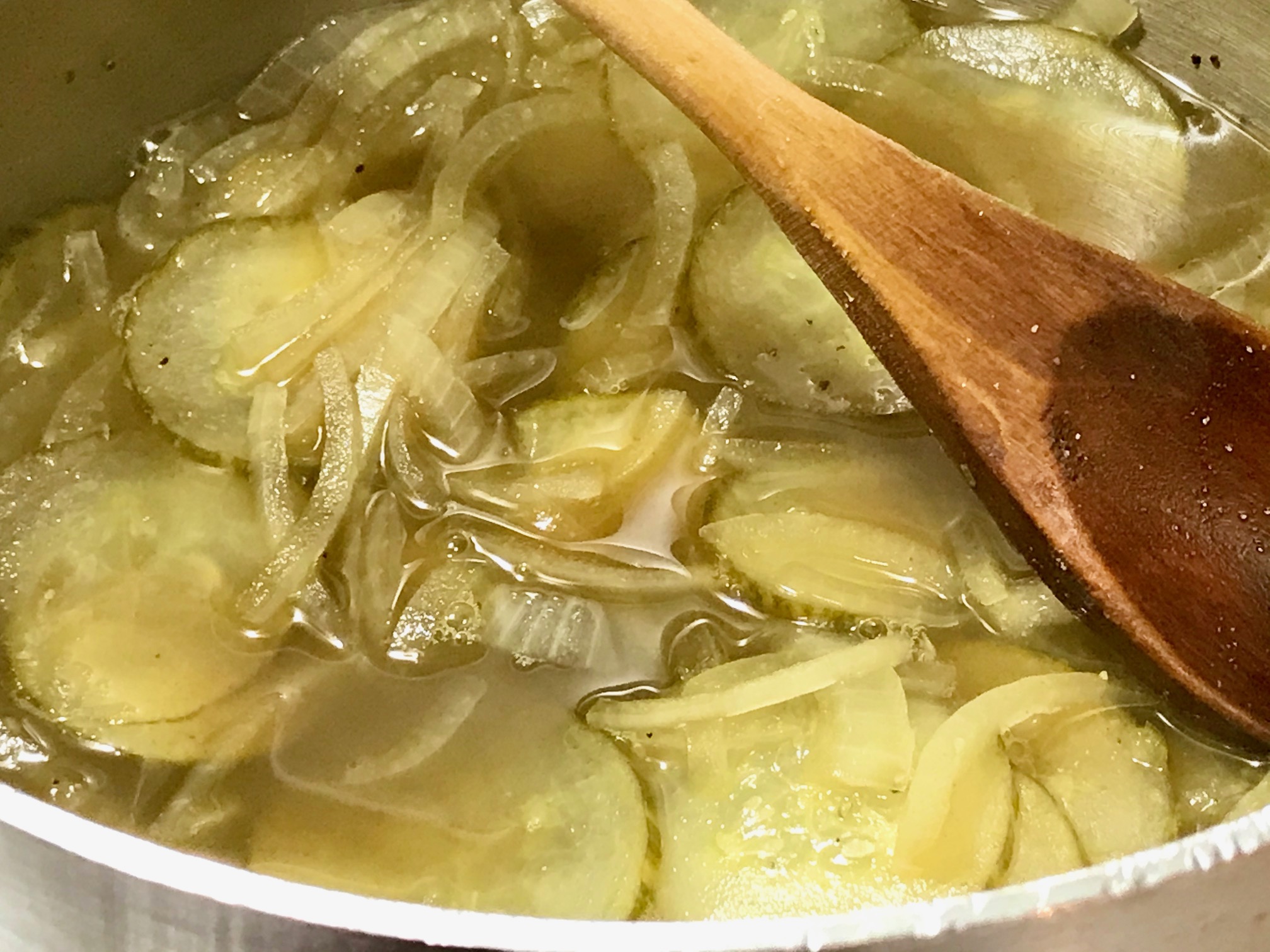 3- Add cucumber and onion. Stir to submerge. Soft-boil for about 3-5 minutes to be sure they’re clean of anything harmful, since we’re not processing them further in a canner.
