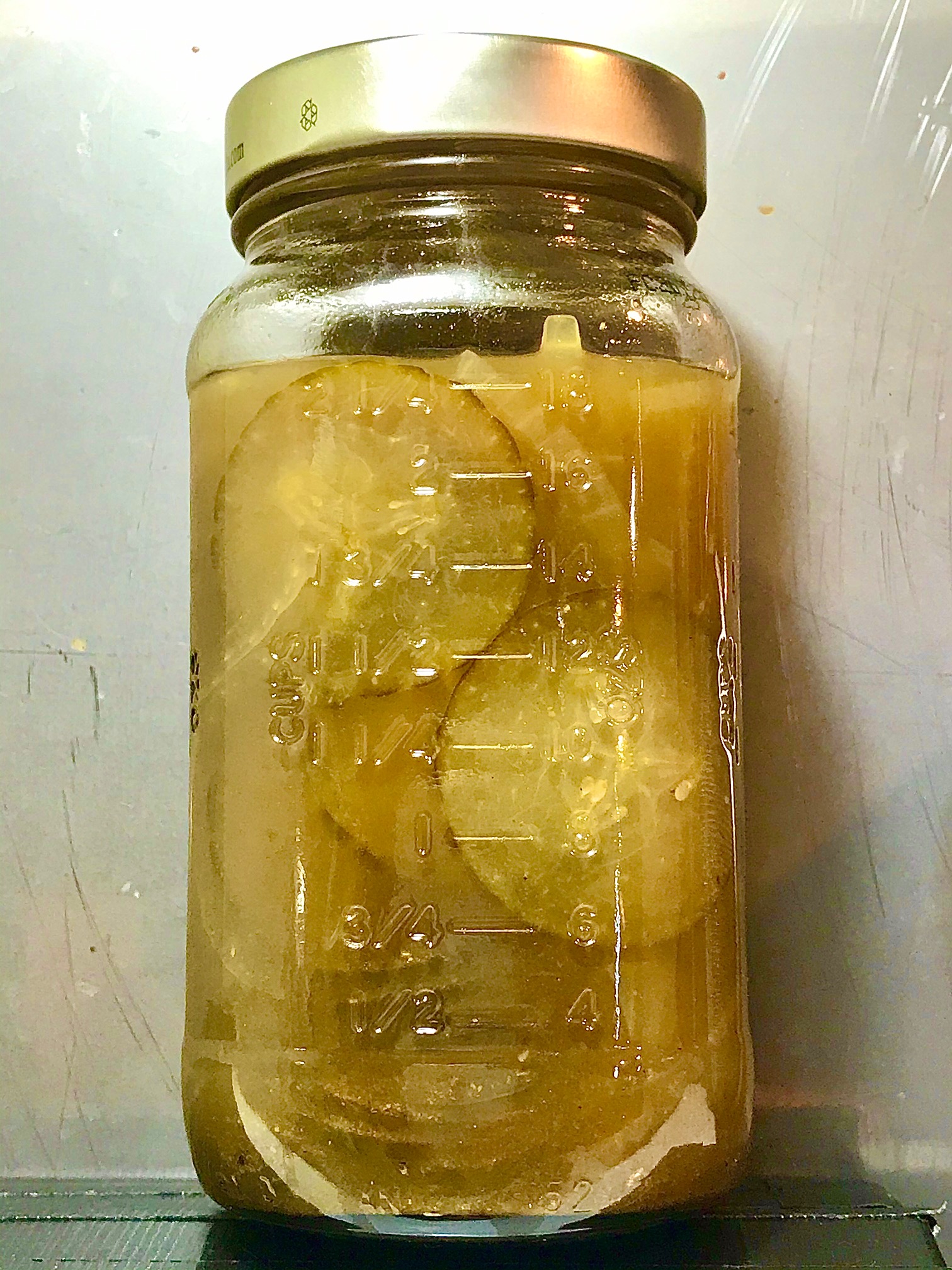 6- Clean around top rim of jar with clean cloth. Screw on top, not so tight that you can’t get it off when it cools to room temperature. When the jar is room temperature to touch, refrigerate – and don’t forget you have homemade pickles, when you think you have nothing! Not many people anywhere have those! Rich people have somebody else make them – they don’t taste the same – know that.