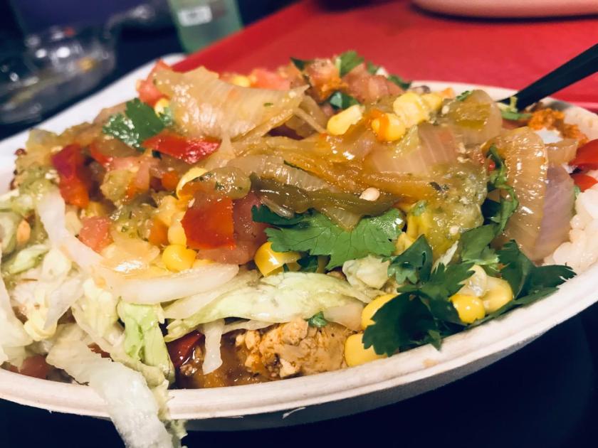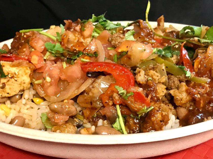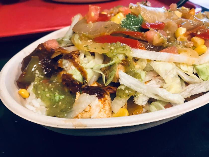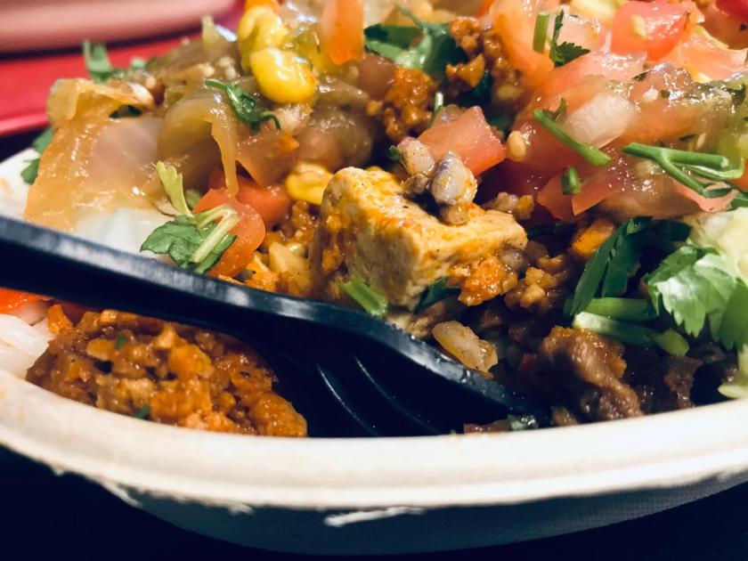 Steve and I both ordered a bowl. Vegan rice and corn, topped with vegan meats, vegan beans, tofu, and then the usual veggies, vegan sauces and of course cilantro.