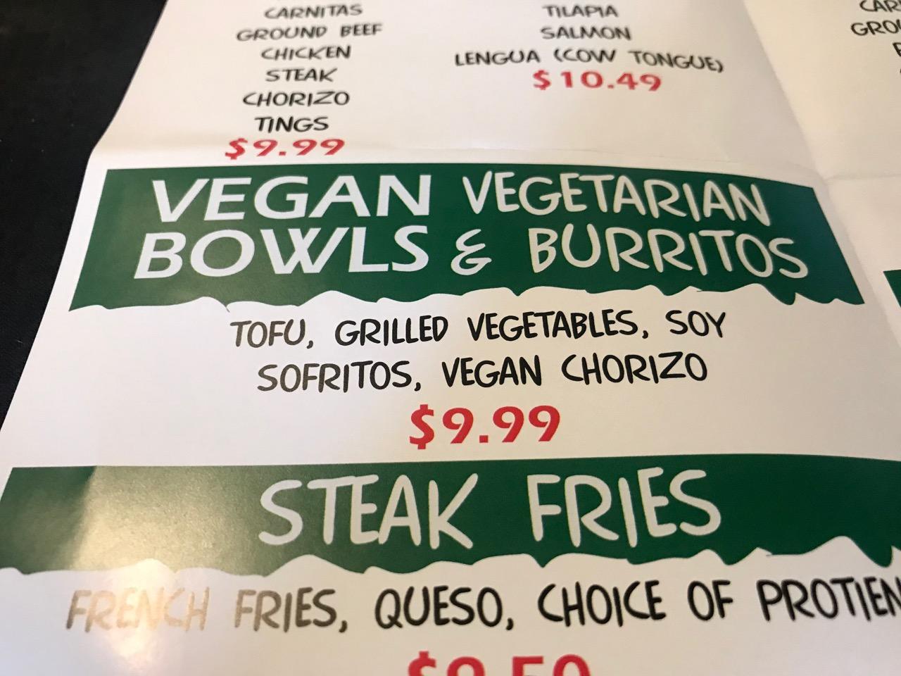 Something I didn’t know is the Mexican rice is made with chicken broth; that’s why they had a vegan rice. Two out of the three beans were vegan and they knew what vegan meant; they didn’t have to go back in the kitchen to check with the boss.