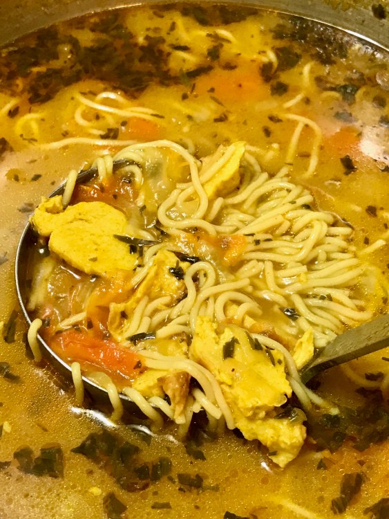Soy chicken nuggets, sweet onion strips, and fresh carrot ribbons simmered in a garlic tarragon coriander broth with millet and brown rice Ramen by Lotus Foods. Ramen Extraordinaire!! The finest of the fine!
