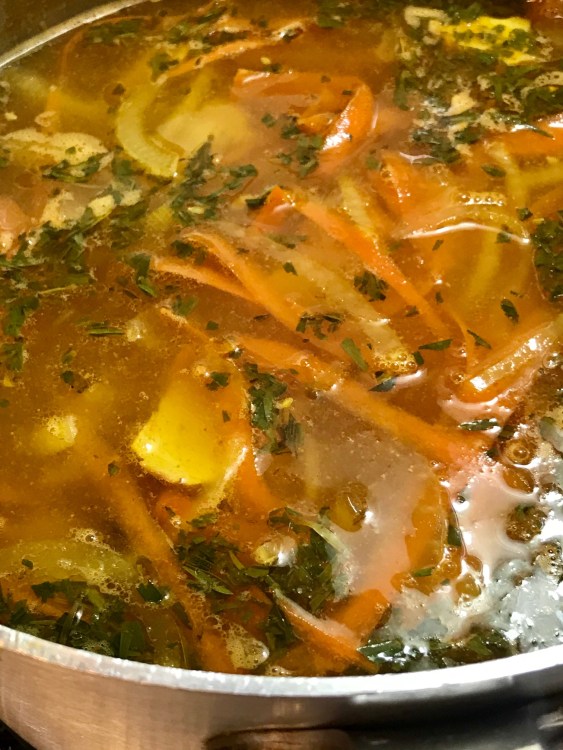 1- In large soup pot place chicken, water and salt. Bring to slow boil and cook about 15 minutes to soften chicken pieces.