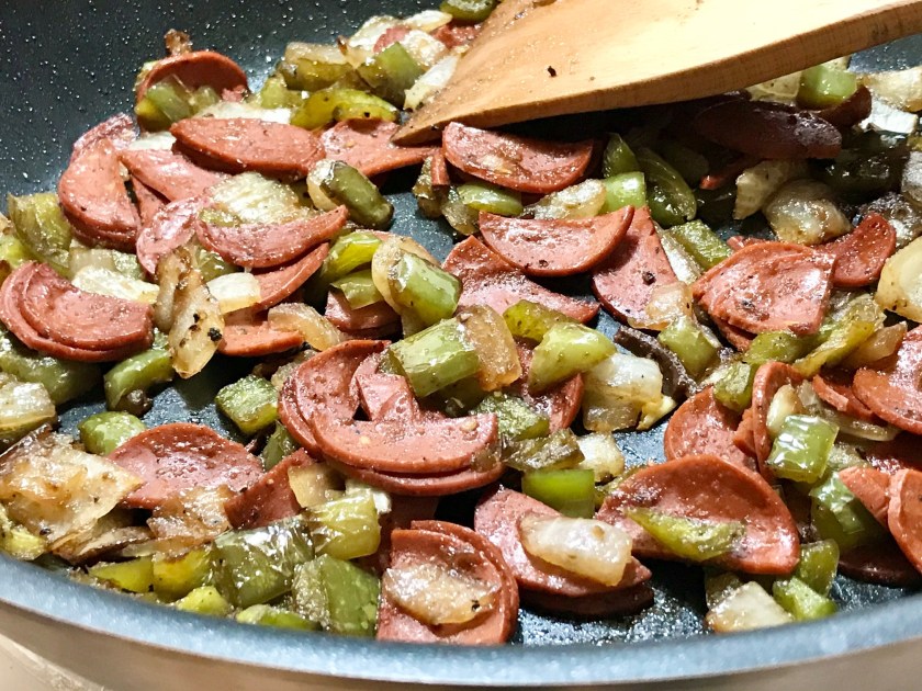 Add green pepper, onion. Stir to coat and sauté till almost soft.