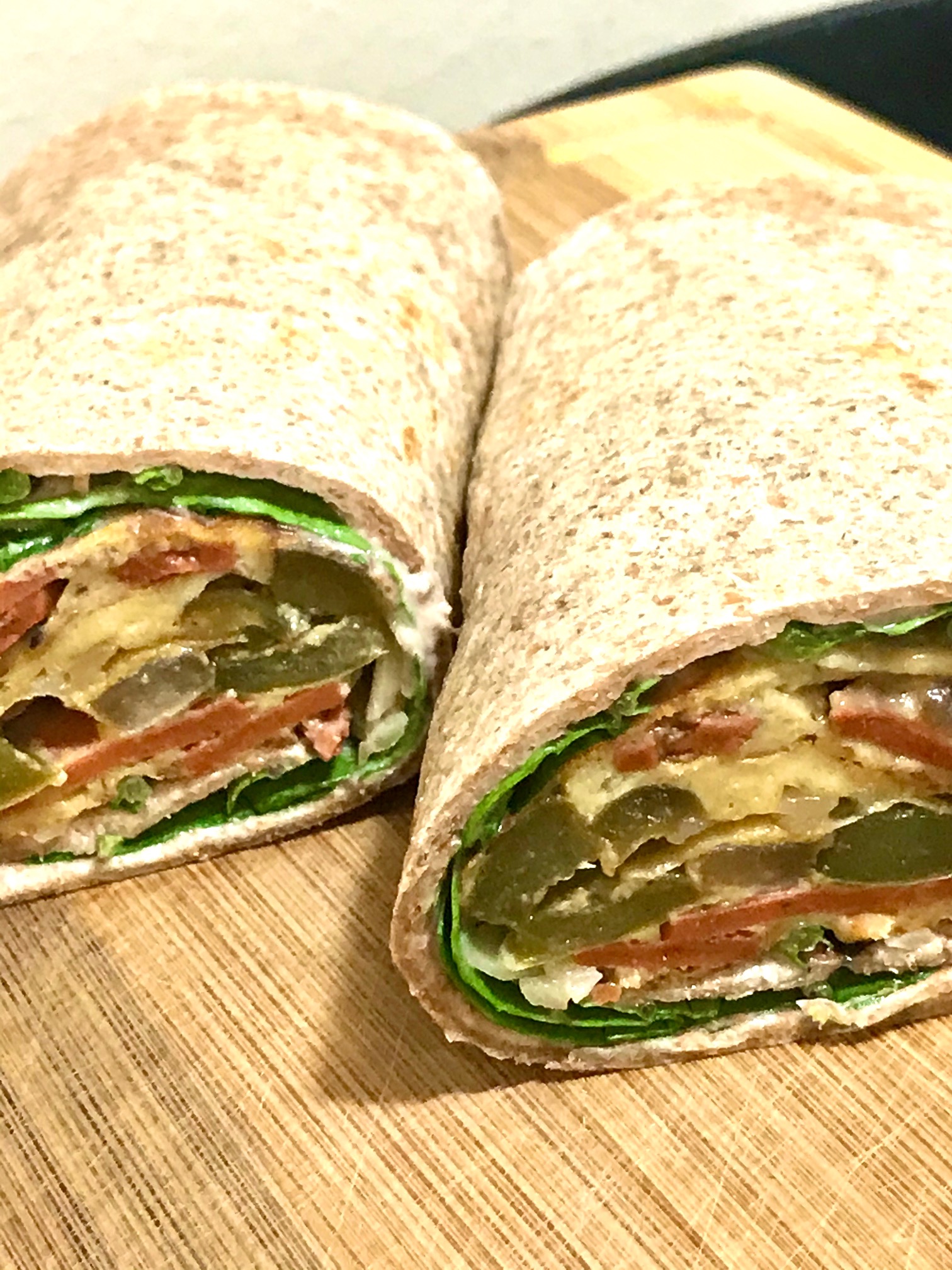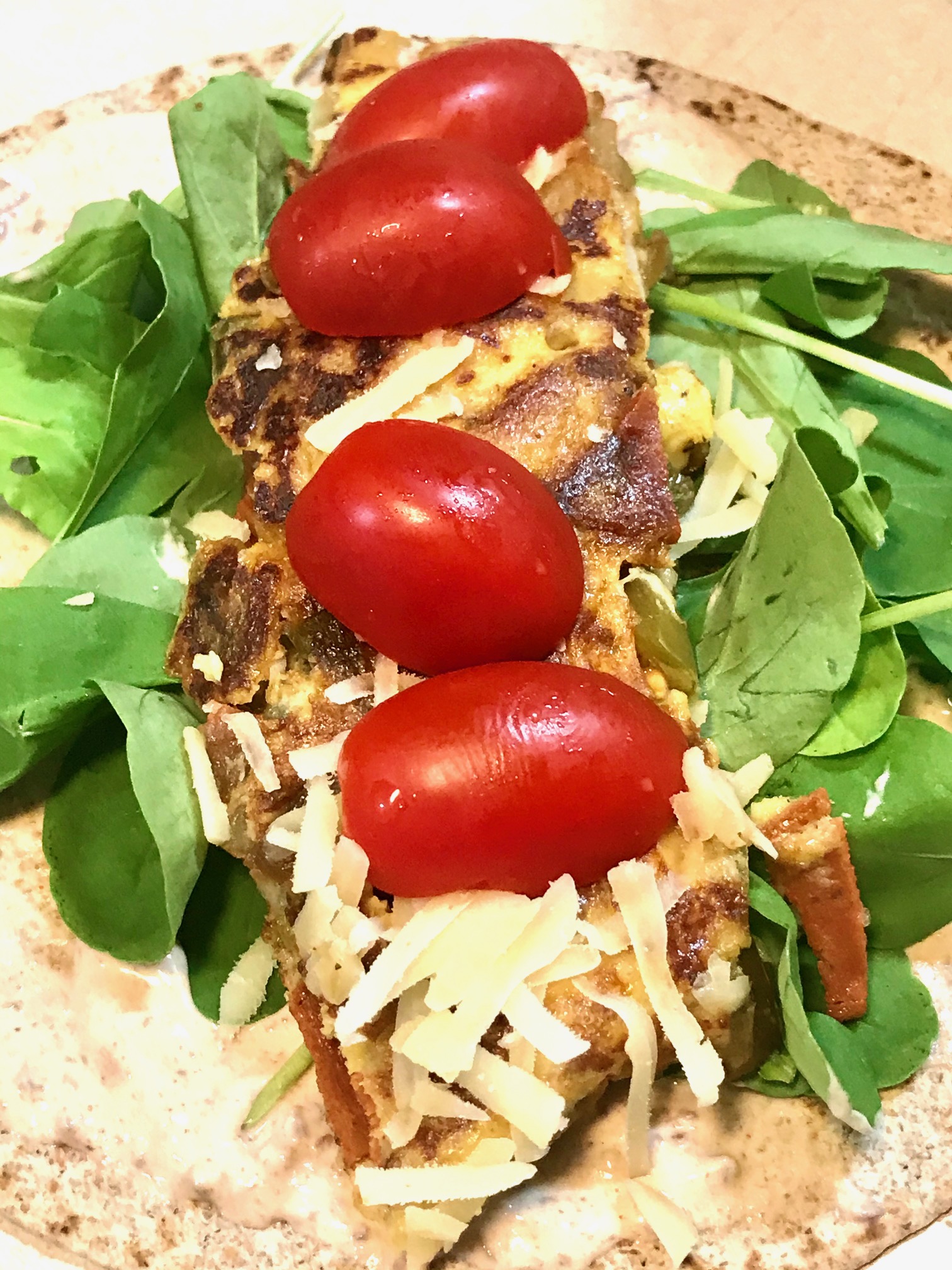 Pan-heated flour tortillas spread with CREAMY OLIVE SAUCE. Layered with arugula, PEPPERONI & PEPPER JUST EGG OMELET and fresh tomatoes!