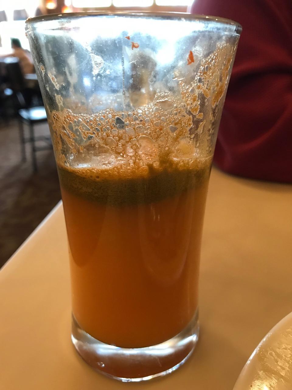 The carrot juice looked like they didn’t wash the carrots or they used seconds. Too much foam and the dark signaled old, dirty carrots.