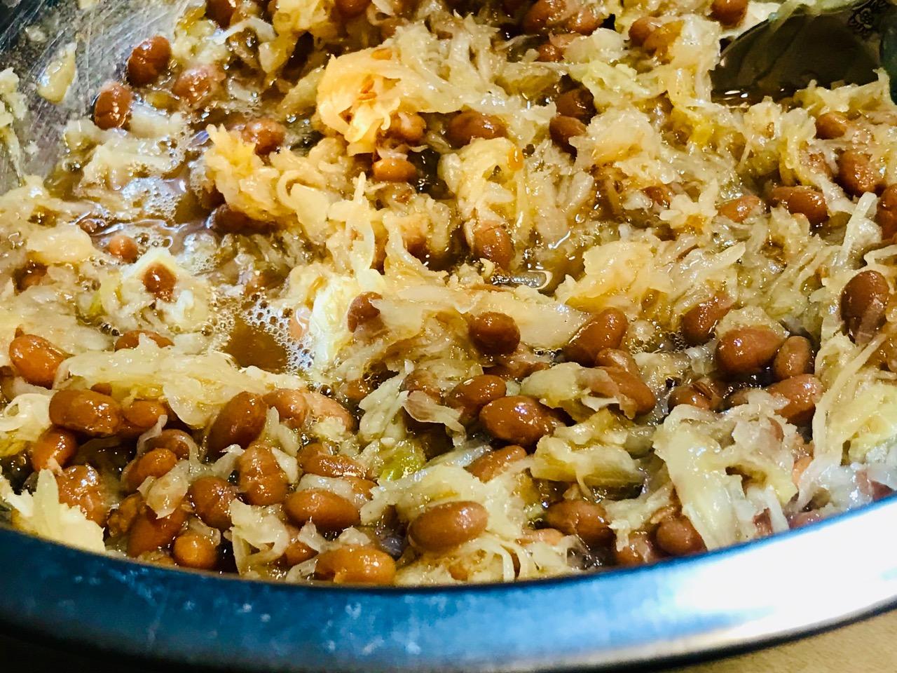 4- When ready to assemble, place beans and sauerkraut into large bowl and stir well to disperse evenly.