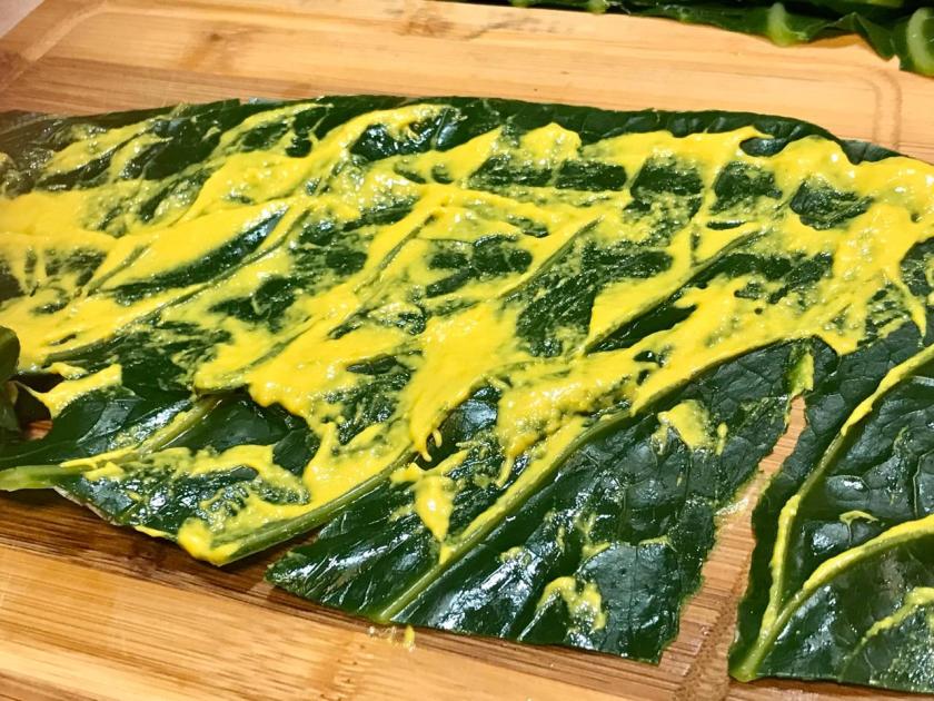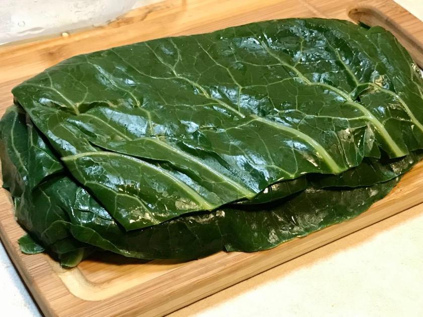 1- Wash collards, lay each leaf flat on board, cut out large center vein.